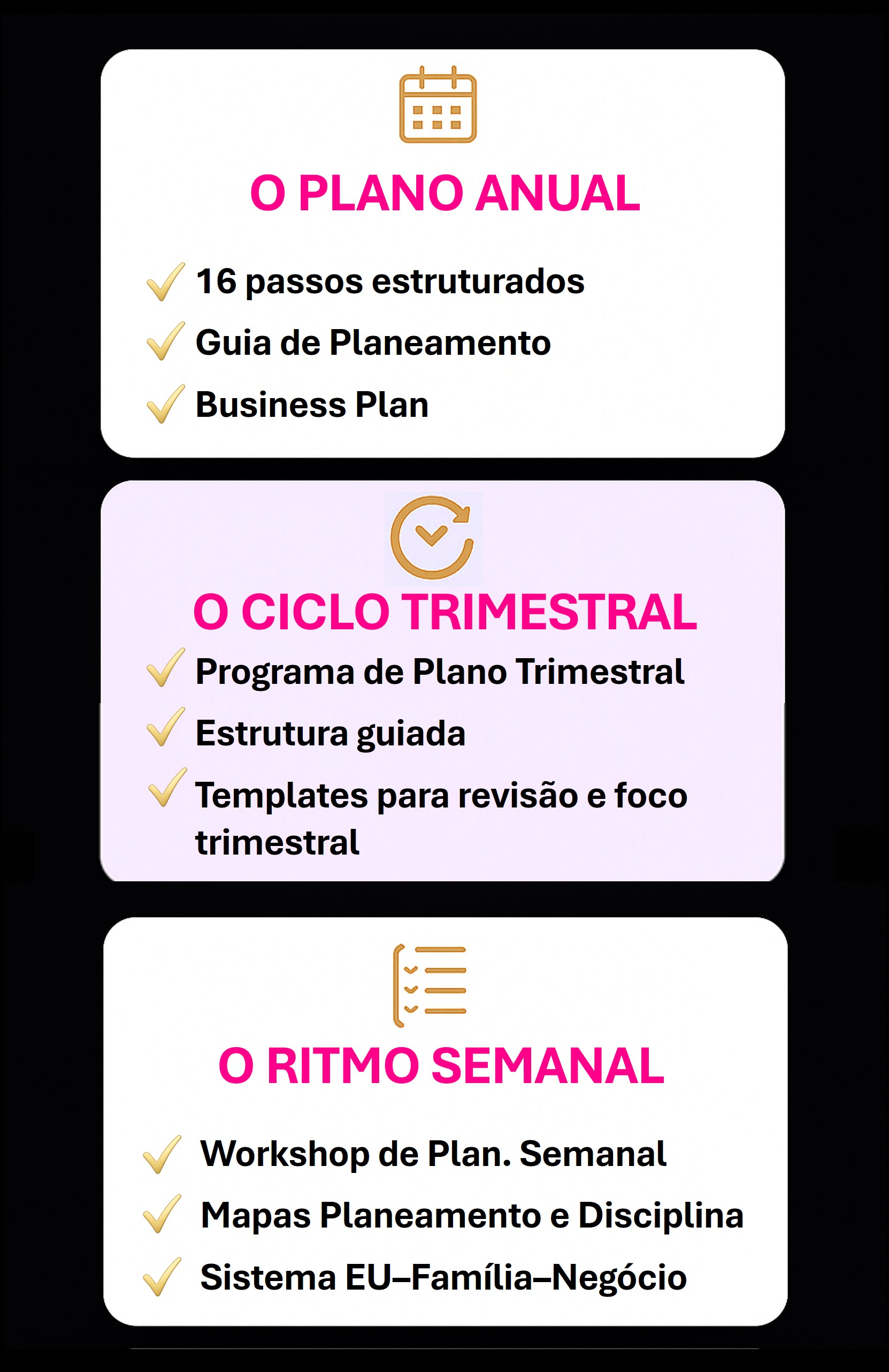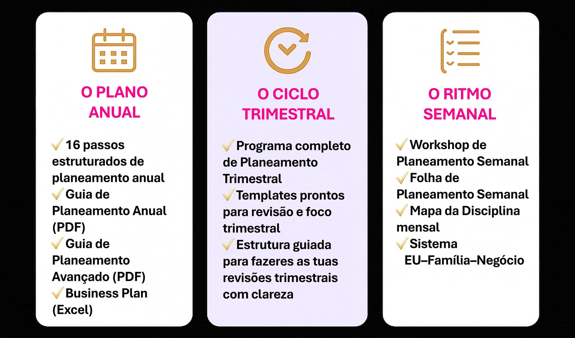 E o ritmo semanal mantém-te alinhada com as ações que realmente movem o teu negócio.